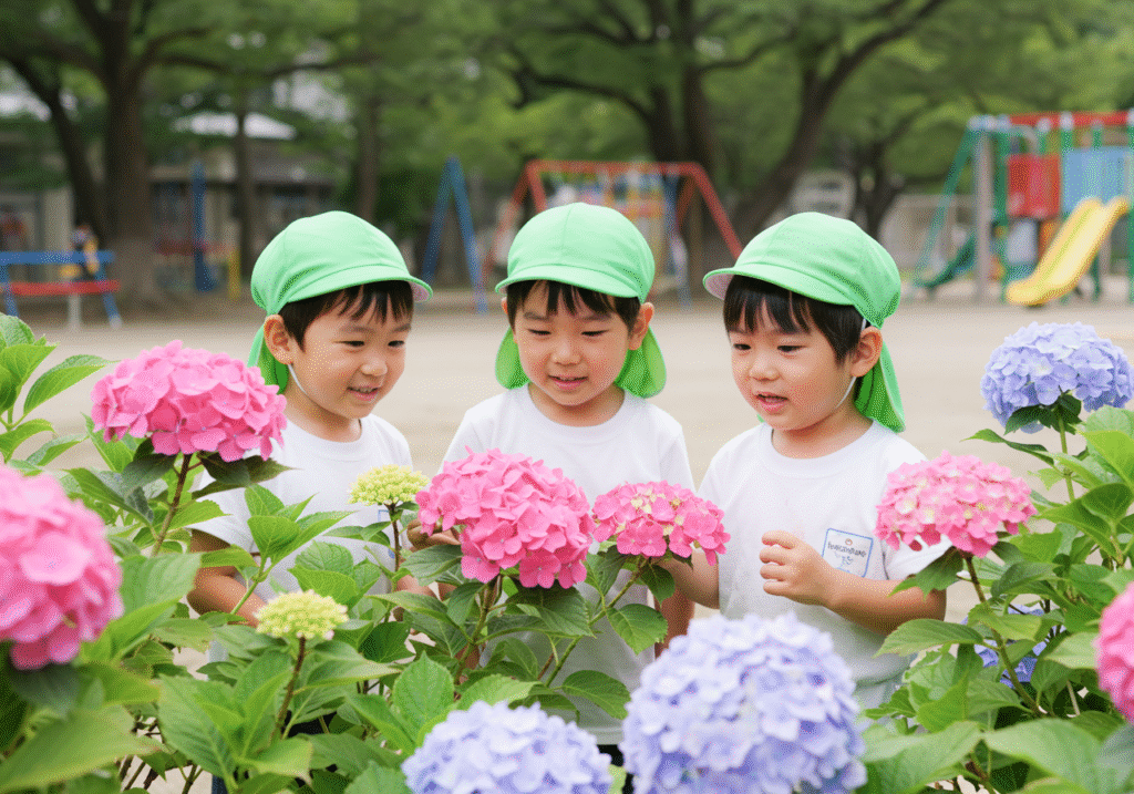 園庭には木々の緑が広がり、季節ごとにさまざまな花が咲き、風の香りや鳥の声が日々の中に溶け込んでいます。