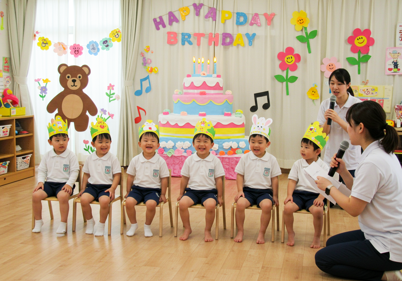 今日は、5月生まれのお友だちのお誕生日会を開き、みんなで心を込めてお祝いしました。お誕生日のお友だちは、少し照れながらも嬉しそうにステージに立ち、名前や年齢を元気に発表してくれました。みんなで「ハッピーバースデー」のお歌を歌い、お祝いの拍手をたくさん送りました。そのあとは先生たちによる楽しい出し物があり、子どもたちは目を輝かせながら観ていました。笑い声があふれ、あたたかい雰囲気に包まれた一日となりました。これからも、みんなの成長を大切に見守りながら、一人ひとりのお誕生日を楽しくお祝いしていきたいと思います。